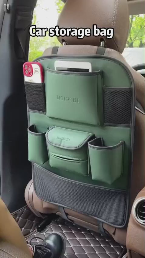 This Multifunctional car back seat organizer will enhance any road trip. Made with stylish PU leather and a sturdy board, it provides convenient surfaces for snacks, meals, or planning your trip. Our Car backseat organizer is equipped with a folding table, making it perfect and convenient for dining, working or entertaining. Improve space utilization in the car and enjoy a hassle-free trip with this highly versatile organizer. Our car back seat organizer with multi-functional design allows you to store and organize all your must-have items including cell phones, tablets, magazines, water bottles and more. Keep your car tidy and enjoy hassle-free trips.